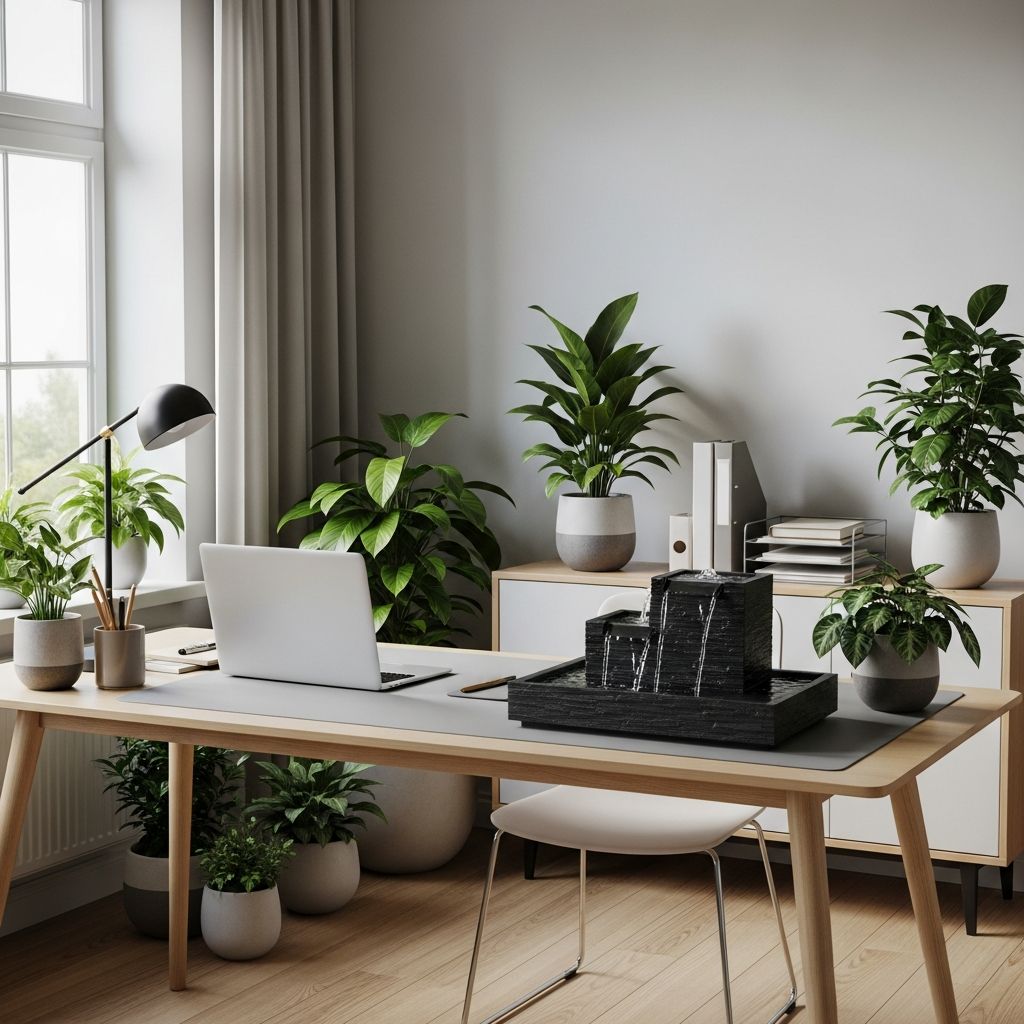 El sonido del agua corriendo es uno de los mejores purificadores auditivos que existen. Una pequeña fuente de mesa con un flujo constante ayuda a que la energía no se estanque, especialmente en áreas de trabajo o cerca de la entrada principal. Es un recordatorio constante de que todo fluye y nada se detiene, eliminando el estrés de forma casi imperceptible.