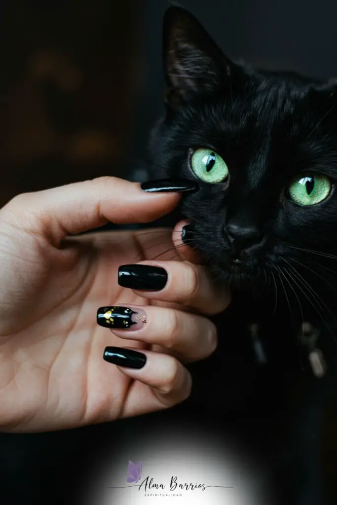 ✔️ Silueta de un gato negro con ojos brillantes en una uña.