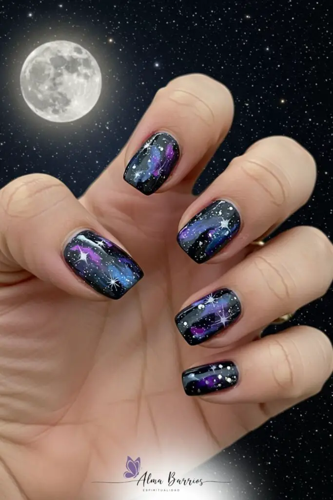 Tip Mágico: Para un efecto más místico, usa top coat brillante en solo algunas uñas para simular el brillo de la noche estrellada.